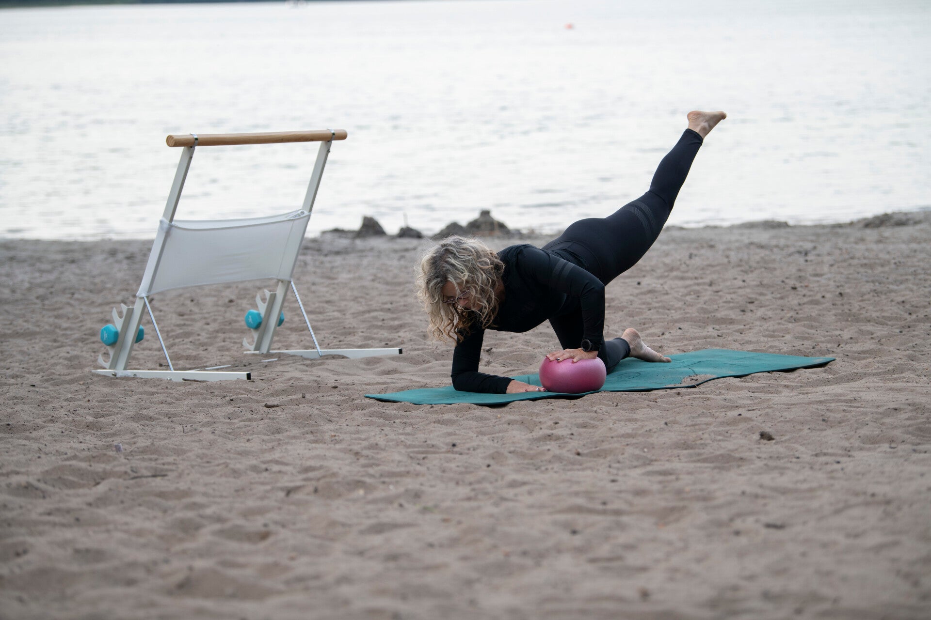 Was du brauchst: Yogamatte, bequeme Kleidung und diverse Hilfsmittel wie Pilatesrolle, Pilatesball, Yogablöcke, Bänder sowie kleine Gewichte.